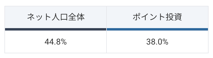 「ポイント投資」検索者の年代は、30代〜40代の割合が高いことがわかります。20代や60代以降は、インターネット人口全体の割合と比較しても低いです。30代〜40代は、老後資金や資産形成などを意識しはじめる人が多い年代のため、まずは投資を試したいというニーズが生まれやすいと推測できます。