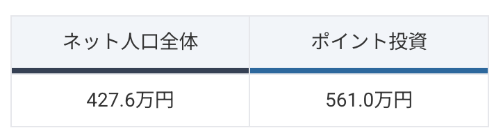 「ポイント投資」検索者の世帯年収の平均は、561.0万円と、インターネット人口全体よりも140万円程度高いことがわかります。