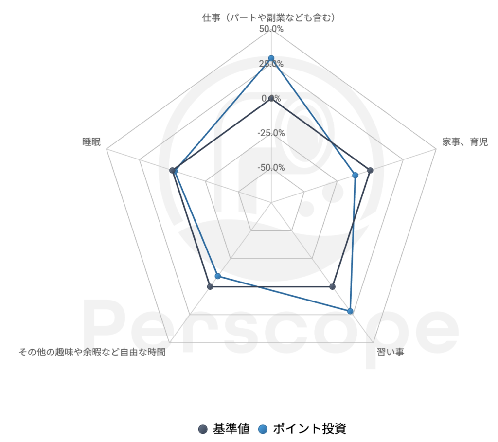 「ポイント投資」検索者は、「仕事(パートや副業なども含む)」と「習い事」のスコアが高いことがわかります。