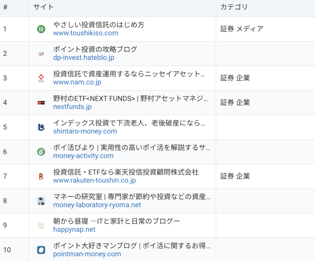 「ポイント投資」検索者が特徴的によく見ているサイトは、「やさしい投資信託のはじめ方」や「ポイント投資の攻略ブログ」など、投資情報を提供するメディアが多いことがわかります。