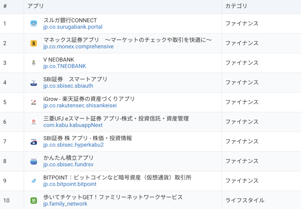 「ポイント投資」検索者が特徴的によく使うアプリは、「スルガ銀行CONNECT」や「マネックス証券アプリ」「V NEOBANK」など、ファイナンス系が多いことがわかります。取引や資産管理に使えるアプリも多く、日常的に投資活動をする様子がうかがえます。